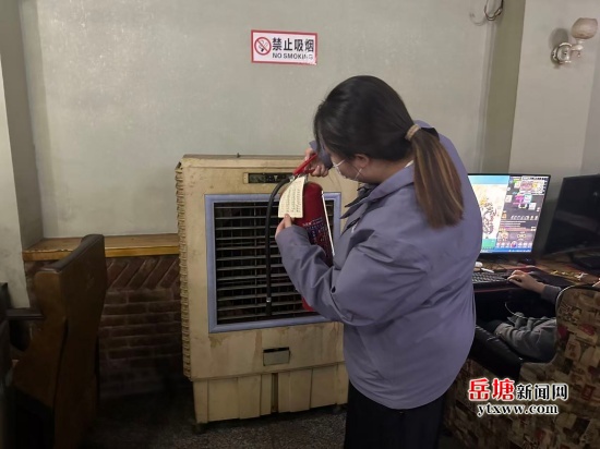 ​社区工作人员走进网吧、宾馆、超市、餐馆等门店,对店内用火用电用气安全,灭火器、应急照明等消防设施是否完好有效,消防通道、安全出口是否畅通无阻等情况进行检查,对发现的问题及时登记,并提醒2家门店及时更换灭火器,确保门店安全。