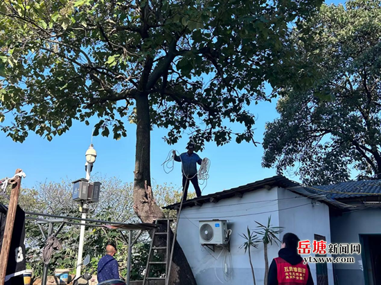 岳塘融媒1121日讯(通讯员:周晓洁)近日,岳塘区五里堆街道向阳社区向阳村3号小区邻长巡查时发现,临近冯家浸地质灾害点处一棵大树主侧枝出现开裂,树木主杆已发生明显倾斜,部分树枝折断。倾斜枝干承载能力下降,一旦折断将影响紧挨在旁的居民房屋,存在较高安全隐患。向阳社区得知此情况后立即行动,组织专业人员对危树进行修剪。