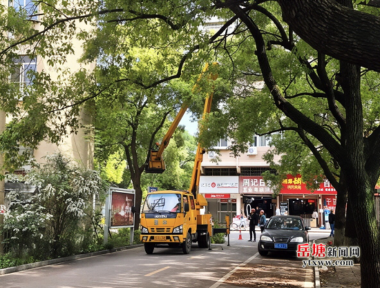 4月23日,湘潭市人大常委会代表工委协调市风景园林中心,出动高空作业车、电锯等设备,对小区内20余棵存在隐患的树木进行修剪和移除。施工过程中,社区党员志愿者全程监督,设置安全警戒线,疏导行人和车辆,确保作业安全。针对树木倾倒可能造成的电线损坏风险,还提前联系供电部门做好应急保障。