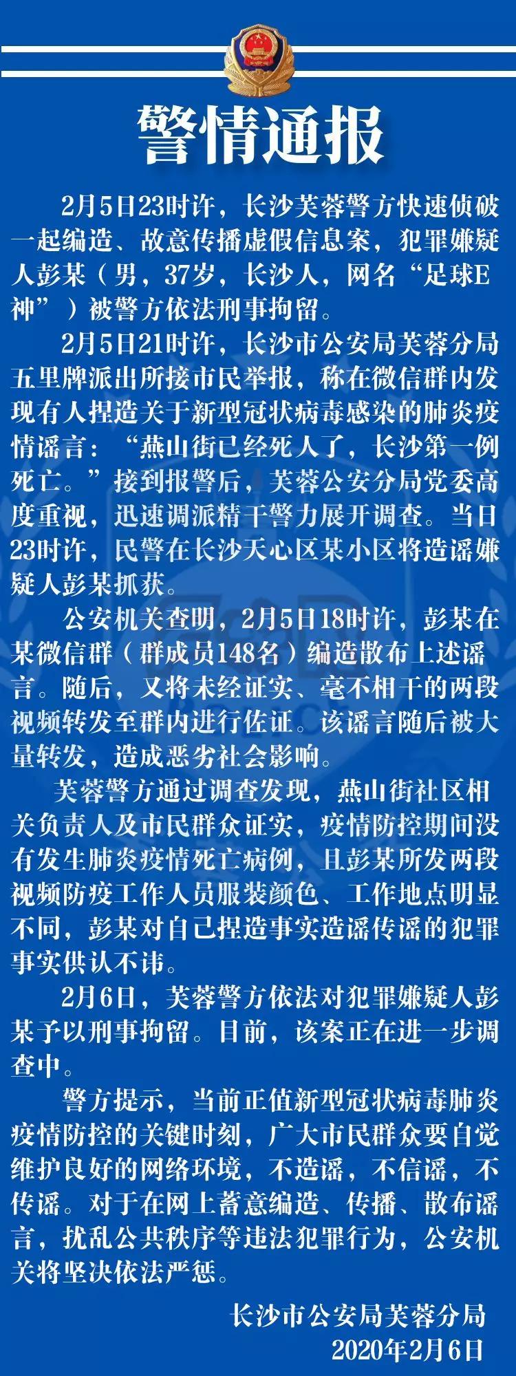 2月5日23时许,长沙芙蓉警方快速侦破一起编造、故意传播虚假信息案,犯罪嫌疑人彭某(男,37岁,长沙人,网名“足球E神”)被警方依法刑事拘留。