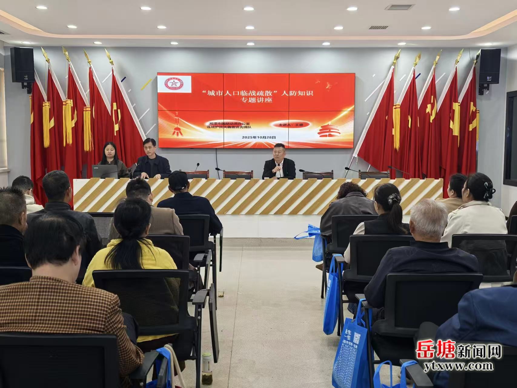 岳塘融媒10月29日讯(通讯员 曾文静)为增强社区居民战时自我防护能力,强化国防观念,普及人防知识,10月28日上午,双马街道吉安路社区联合湘潭市国防动员办公室,组织开展“城市人口临战疏散”人防知识专题讲座,吸引百余名党员、居民到场参与,现场学习氛围浓厚。